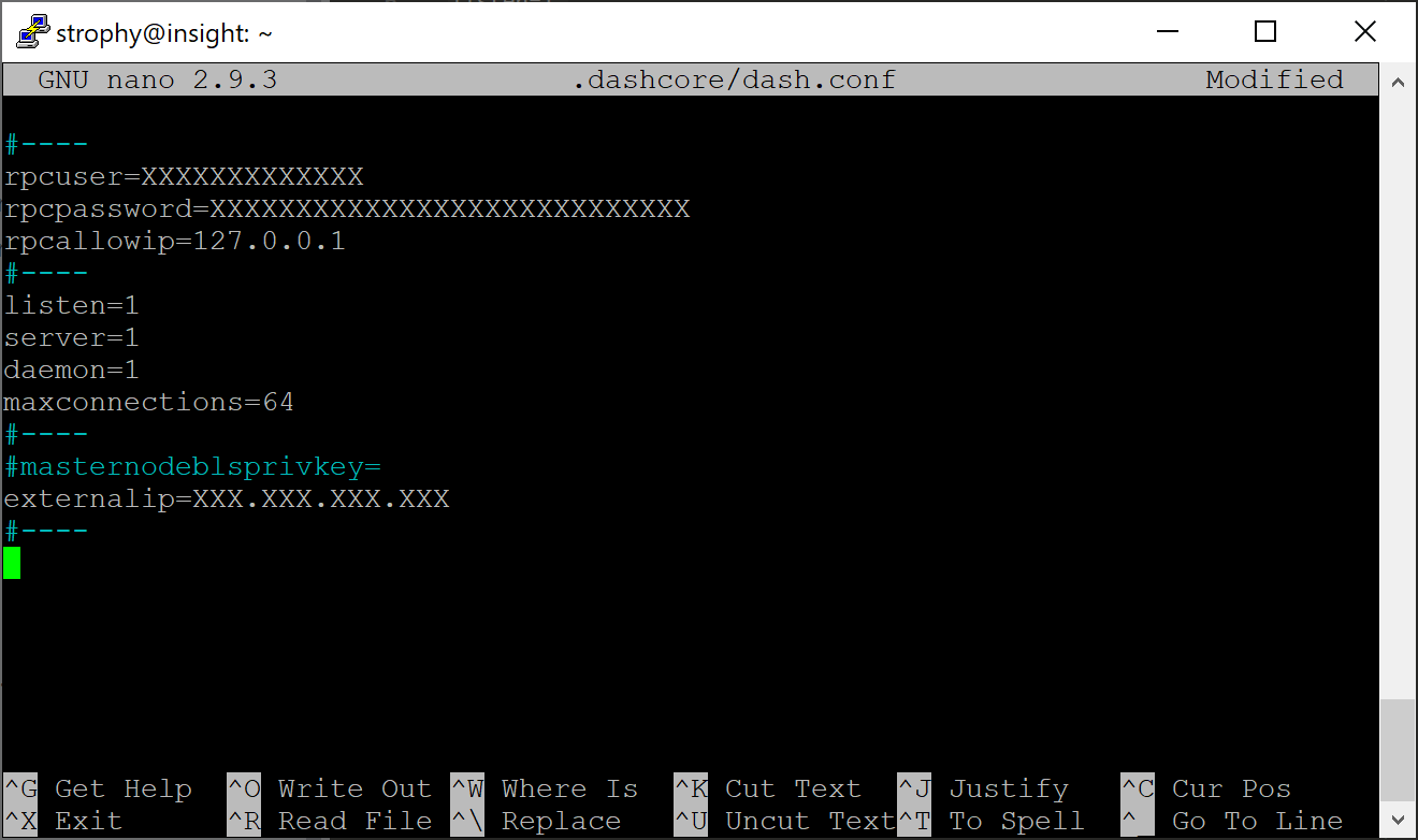 The editor appears with the existing masternode configuration. Add or uncomment this line in the file, replacing the key with your BLS private key generated above: