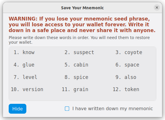 CRITICAL: If you lose your mnemonic seed phrase, you will permanently lose access to your wallet and all funds. Write it down on paper (not digitally) and store it in a safe, secure location. Never share your mnemonic with anyone.